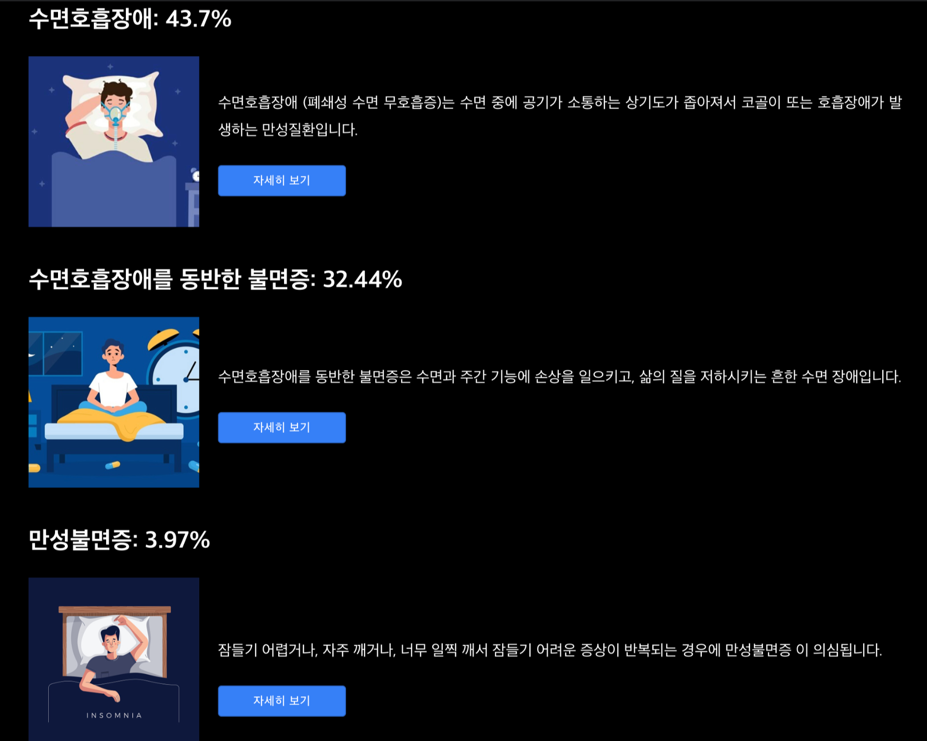 수면호흡장애가 43.7%의 확률로 나왔고, 수면호흡장애를 동반한 불면증은 32.44%, 만성불면증은 3.97%가 나왔다.
